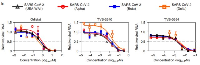 通过下方图表数据可以发现,奥利司他对于不同类型的新冠毒株的复制和感染都有明显的抑制作用。