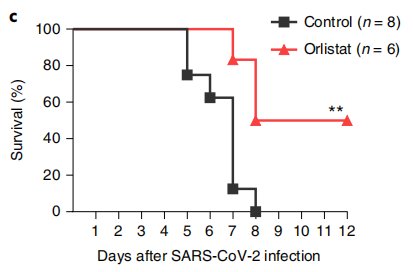 结果表明FAS抑制剂(以奥利司他为代表)能有效抑制几个受试细胞系中的SARS-CoV-2感染和复制。注射奥利司他可以降低肺中新型冠状病毒病毒水平,使得小鼠存活率增加。