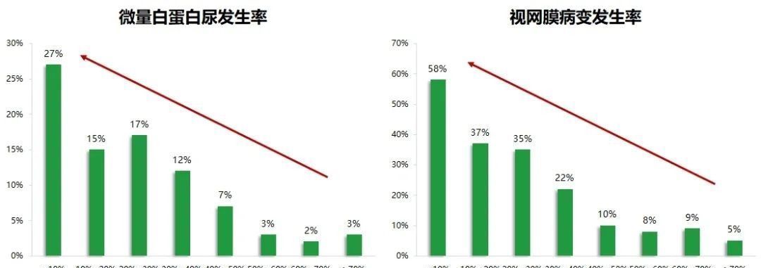 图 3. TIR 越低,糖尿病患者的微量白蛋白尿, 视网膜病变的发生率越高