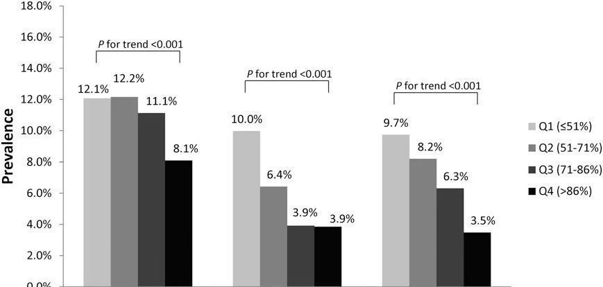 贾卫平教授团队是率先将TIR应用于糖尿病并发症的研究发表于2018年,主要观察了TIR与2型糖尿病患者发生糖尿病视网膜病变(DR)风险的关系[2]。根据疾病的严重程度,DR分为非DR、轻度非增殖性DR(NPDR)、中度NPDR和威胁视力的DR(VTDR)。发现 TIR 与 DR 的严重程度呈显着负相关(图 2)并且与 HbA1c 无关。