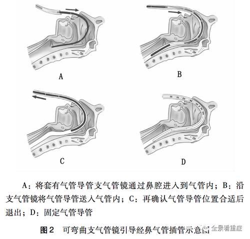 具体操作:将气管插管充分润滑后套在支气管镜上,支气管镜先行经鼻插入患者气管,以此为引导将气管插管插入,如遇阻力可适当旋转插管,最终根据镜下所见调整插管深浅。
