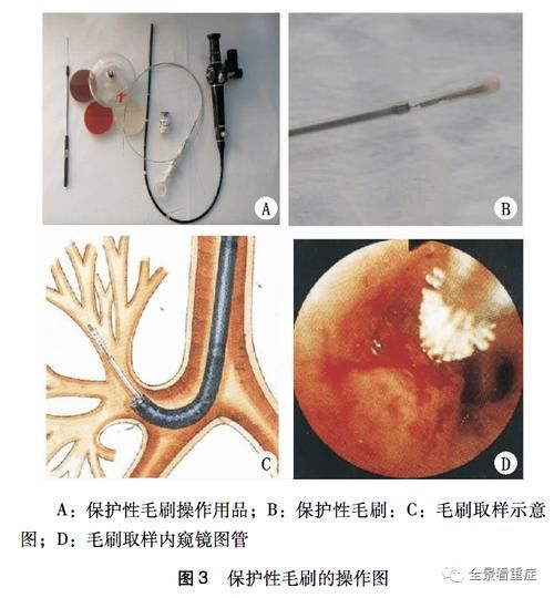 保护性毛刷的操作:支气管镜经声门—气管或者人工气道到达胸部影像显示浸润病灶最明显或镜下显示有脓性分泌物的区域,保护性毛刷经支气管镜吸引孔道进入并伸出支气管镜末端1~2cm后从保护性套管再推出毛刷,顶掉保护性毛刷末端的保护塞(相对分子质量4000的聚乙二醇),毛刷再伸出2cm采集标本,采样后将毛刷缩回到套管中,然后将有套管保护的毛刷从支气管镜中拔出。75%酒精消毒套管末端,将毛刷伸出套管并浸入1mL无菌生理盐水中,充分震荡使标本在无菌溶液中均匀分 布,然后送实验室进行微生物培养。细菌定量培养以≥103CFU/mL作为诊断肺部感染的阈值。